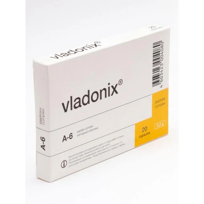 Daily dose contains: (2 capsules), 20mg of peptide complex A-6 (thymus peptides)