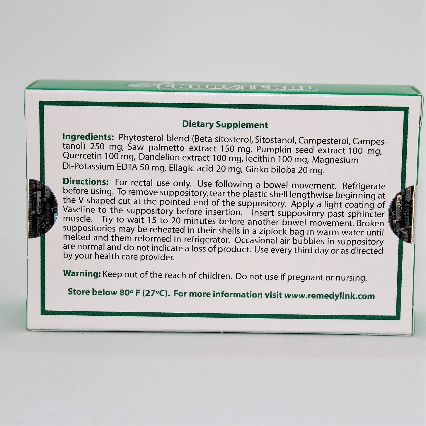 Endosterol suppositories offer state of the art prostate support. Endosterol contains beta-sitosterol, saw palmetto, pumpkin seed, dandelion, ellagic acid and Mg Di-K EDTA.